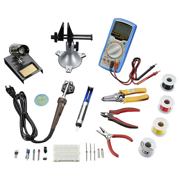 | Contents: | Breadboard, Cutter, Desoldering Tool, Holder, Multimeter, Plier, Power Pack, Soldering Iron, Solder, Vise, Wire Stripper |